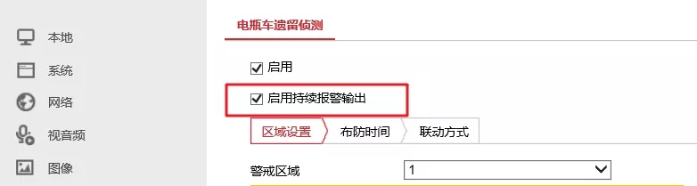 若現(xiàn)場需將IPC檢測到電瓶車的開關(guān)量信號聯(lián)動(dòng)輸出到其他裝置,推薦開啟持續(xù)報(bào)警輸出,延時(shí)時(shí)間配置為5S。