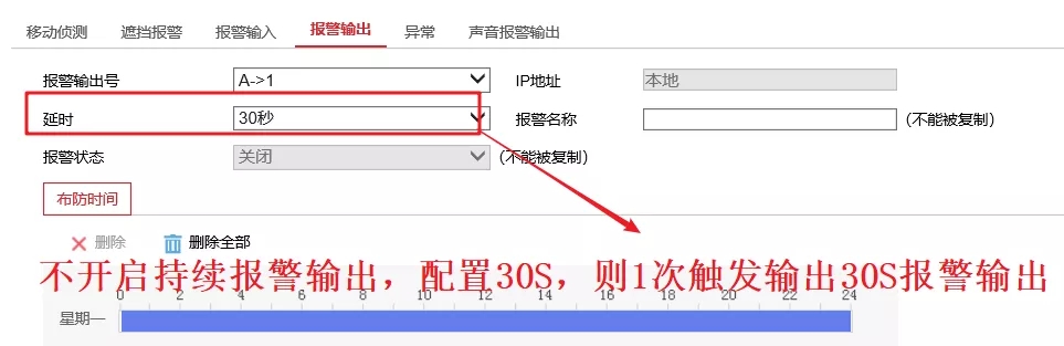 配置好報(bào)警次數(shù)和滿足需要的外放音量。最后設(shè)置好布防時(shí)間(默認(rèn)7 x 24h)。