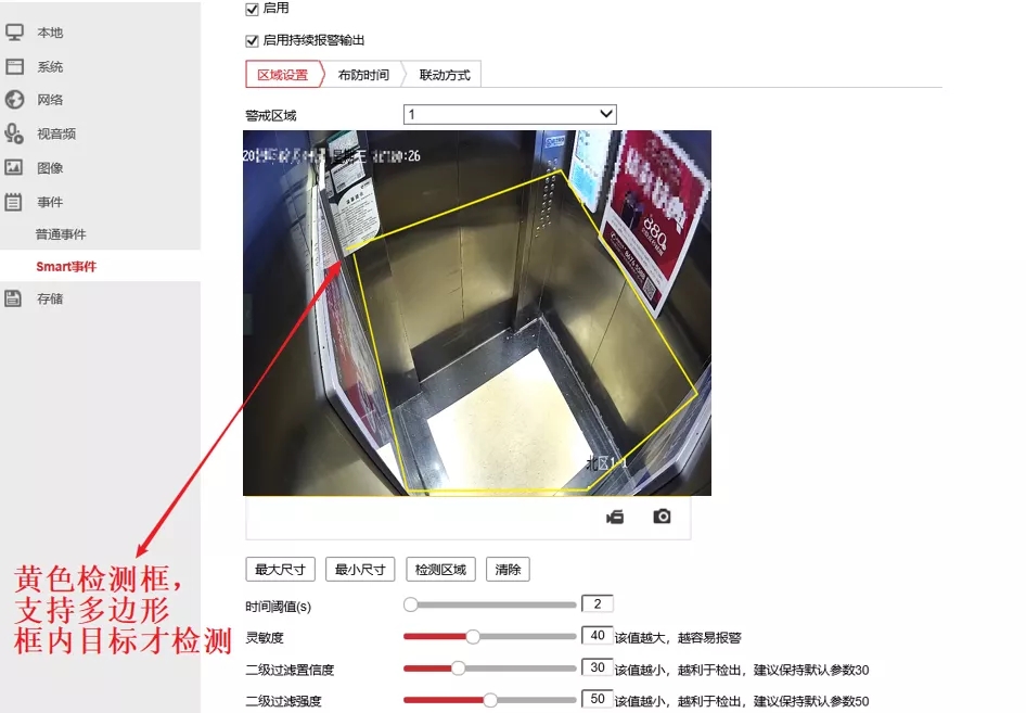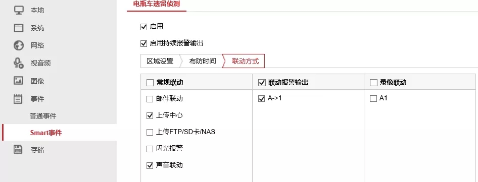 通過【事件】-【Smart事件】-【電瓶車遺留偵測】,勾選【啟用】和【開啟持續(xù)報(bào)警輸出】,繪制檢測區(qū)域。