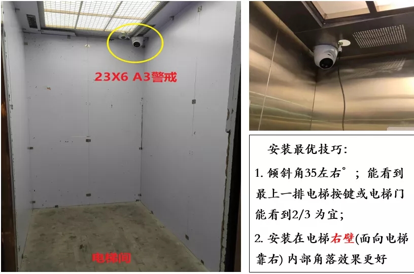 角度調(diào)整可參考如下經(jīng)驗(yàn):在電梯門口縫隙處站一個(gè)人,從監(jiān)控畫面看,能看到人眼睛的位置。或直觀來看,攝像機(jī)視頻畫面能覆蓋右側(cè)電梯門上最頂部的按鍵為佳。